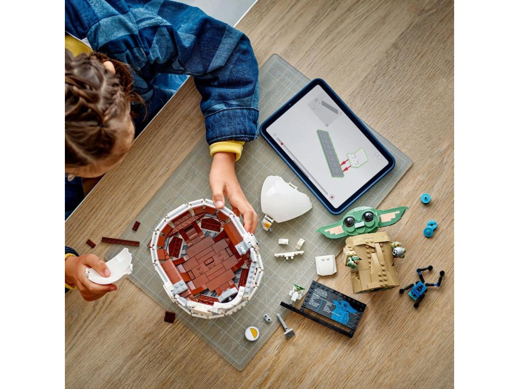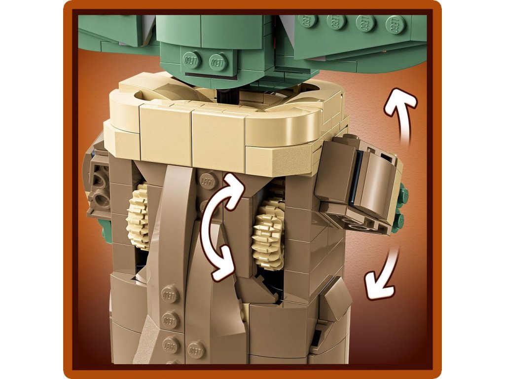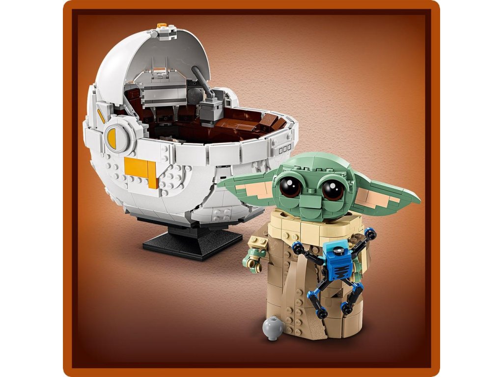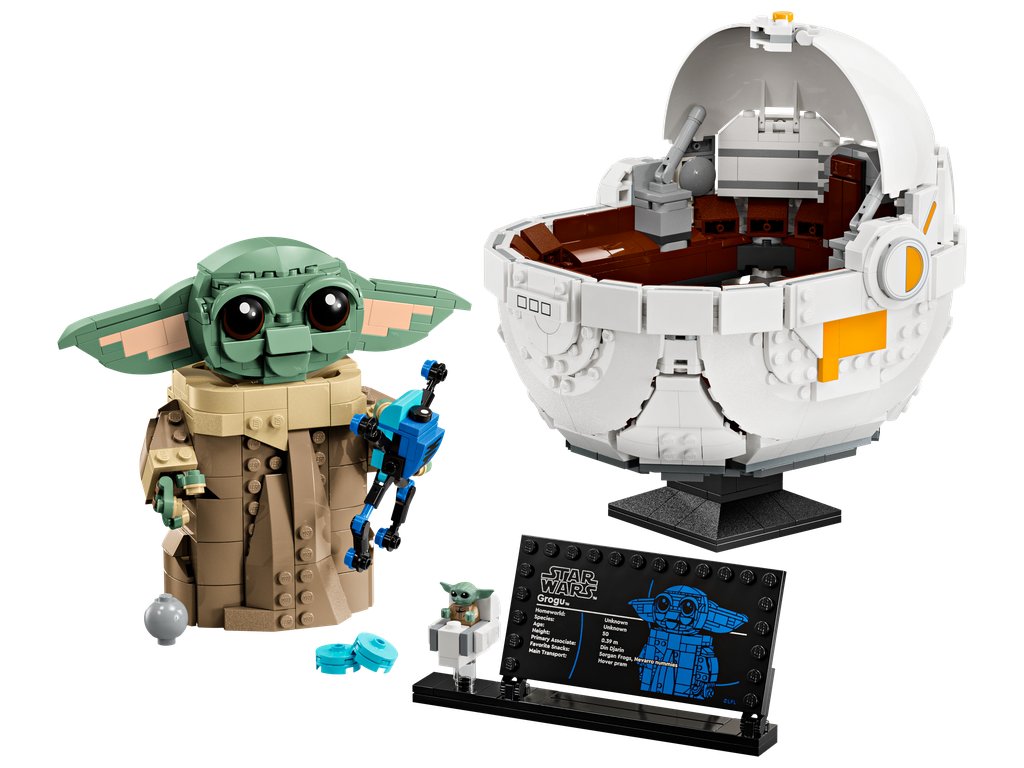 Hlavní model této sběratelské stavebnice Star Wars doplňuje figurka LEGO Groga ve standardní velikosti v malém sestavitelném vznášejícím se kočárku a cedulka s informacemi, kterou můžete doplnit tento veselý výstavní kousek.