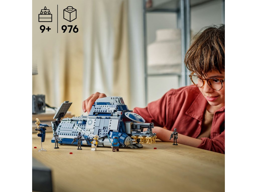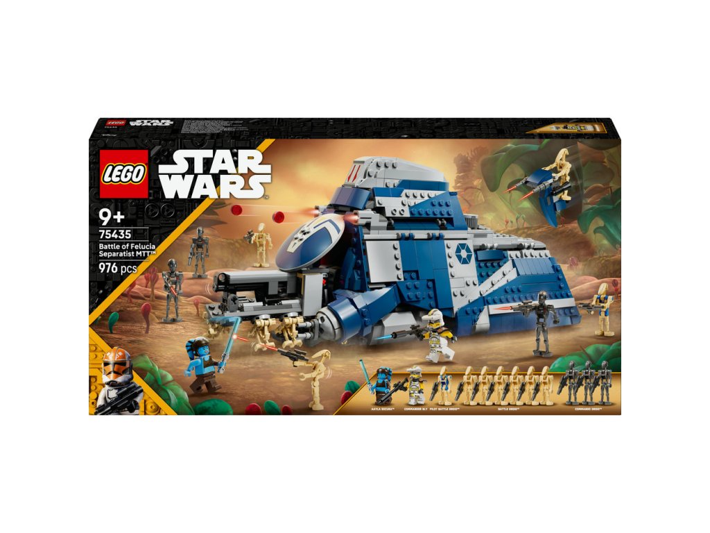 Připomeňte si akční scény z bitvy o Felucii ze seriálu Star Wars: Klonové války se stavebnicí MTT Separatistů (75435) pro holky, kluky a fanoušky od 9 let. Toto sestavitelné vozidlo Star Wars™ se pyšní řadou autentických detailů, které inspirují ke kreativnímu hraní, včetně stojanu na upevnění droidů, který vytlačíte předním poklopem otočením knoflíku. MTT má také skládací boční panely pro snadný přístup do detailního interiéru, pilotní kokpit, spídr STAP uložený v zadním prostoru, 2 vystřelovače a skrytá kola pro plynulý pohyb po rovném povrchu. Až si děti dohrají, vystaví si toto úžasné vozidlo jako dekoraci. Tato stavebnice představuje skvělý dárek Star Wars pro děti a obsahuje 2 minifigurky LEGO® – Aaylu Secura se světelným mečem a velitele Blye s blasterovou puškou – a navíc 3 figurky LEGO komando droidů a 6 bitevních droidů s blastery a figurku LEGO bitevního droida pilota. Stavebnice obsahuje 976 dílků.Dodatočné parametre
