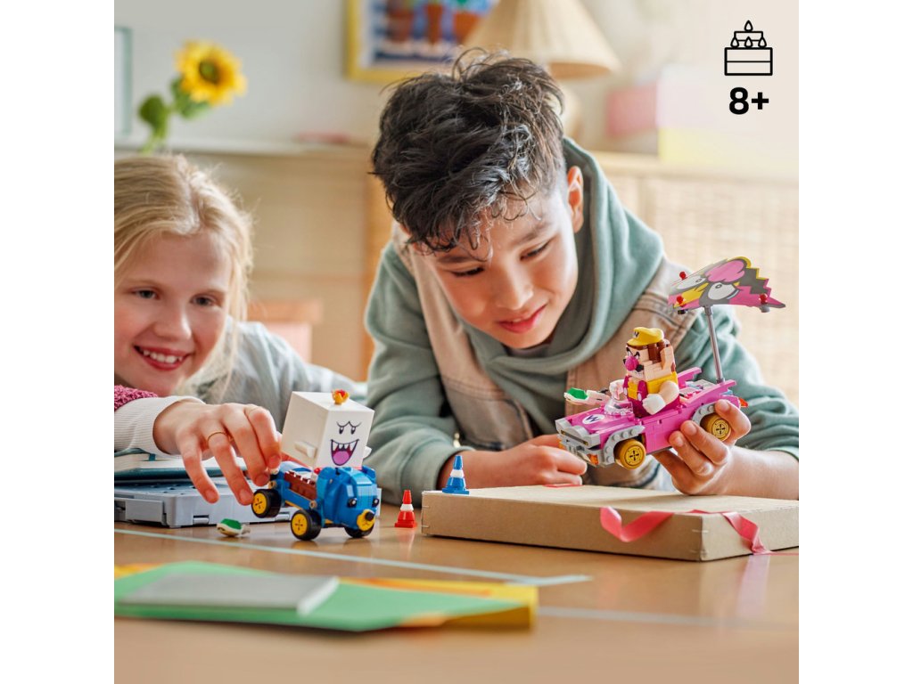 Závoďte, driftujte, létejte a bojujte s tímto setem LEGO® Super Mario™ (72038) Mario Kart™ – Wario a King Boo. Set představuje zábavný dárek pro kluky, holky a obecně gamery od 8 let a obsahuje 2 figurky LEGO Super Mario, modely oblíbených vozidel Badwagon a Teddy Buggy z kostek a 2 dopravní kužely. Každá motokára má funkci vystřelování krunýřů a driftování a Badwagon má odnímatelný kluzák, který lze připojit i k Teddy Buggy. Umístěte figurku LEGO® Mario™, LEGO® Luigi™ nebo LEGO® Peach™ (ze setů 71439, 71440, 71441 nebo 72043 – prodávají se samostatně) do jedné z motokár pro interaktivní hraní, čímž se spustí zvukové a vizuální efekty Mario Kart, včetně zvuku troubení, driftování a létání Návod na stavění tohoto setu Nintendo LEGO najdete v krabici nebo v aplikaci LEGO® Super Mario™. Prohlédněte si i na další sety LEGO Super Mario: Mario Kart (prodávají se samostatně), se kterými můžete závodit a bojovat s dalšími postavami a vozidly. Stavebnice obsahuje 512 dílků.Dodatočné parametre