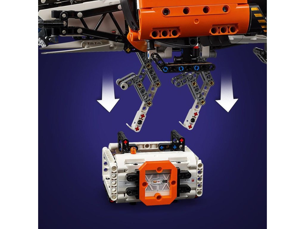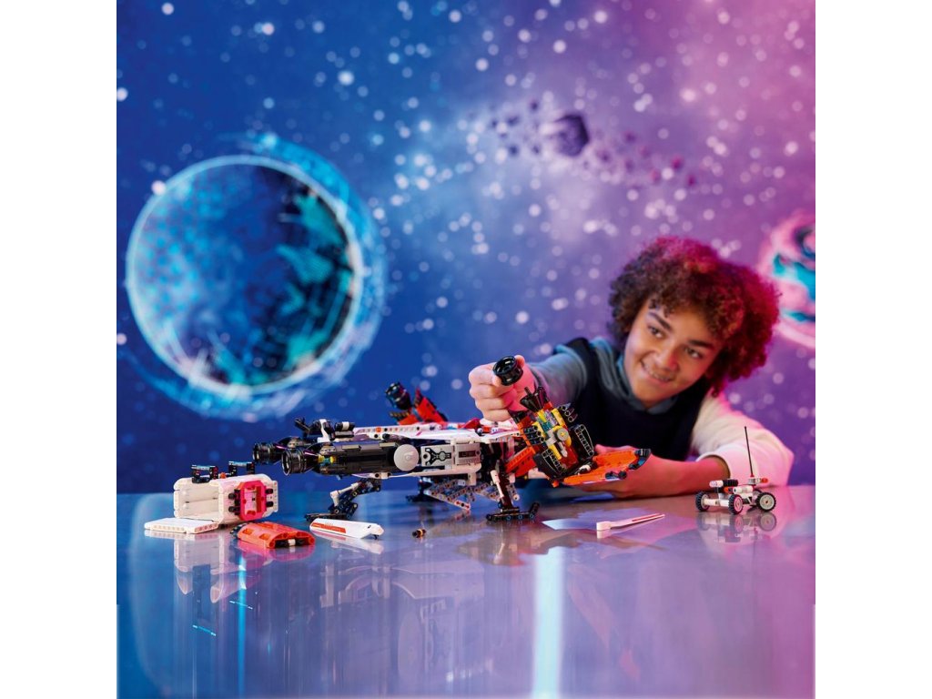 Stavebnice přináší řadu úžasných funkcí, včetně ozubených kol, které roztáčí motory, vysouvají a zasouvají přistávací podvozek a spouštějí drapák na uchopení nákladního modulu s miniaturním vesmírným vozítkem. Na horní straně se nachází rukojeť, díky které mohou malí fanoušci vesmíru při hře s touto futuristickou vesmírnou lodí létat po místnosti.