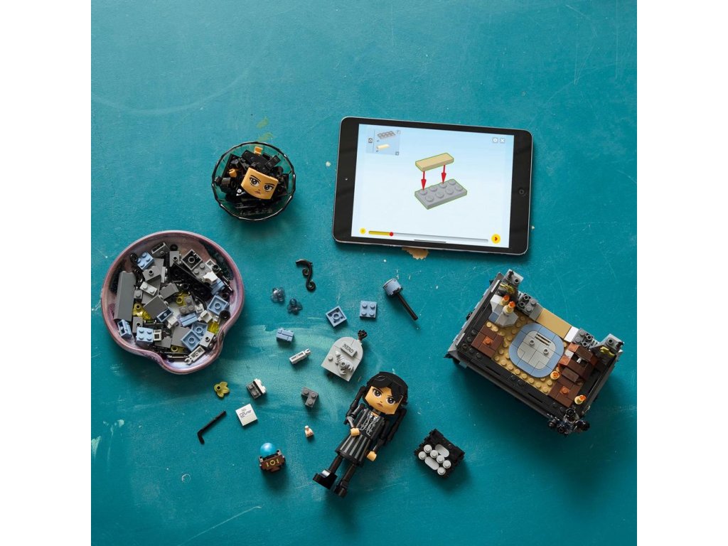 Digitální verzi návodu na stavění najdete v aplikaci LEGO Builder. Na zadní straně základny podstavce na vystavení najdete samolepku s QR kódem, kterou lze naskenovat pro snadný přístup k digitálnímu návodu na přestavení nebo změně oblečení Wednesday. Aplikace umožňuje dětem přibližovat a otáčet modely ve 3D a spoustu dalšího.
