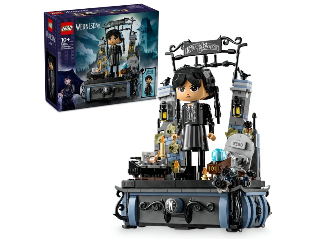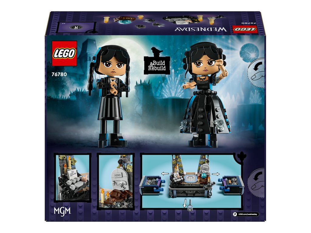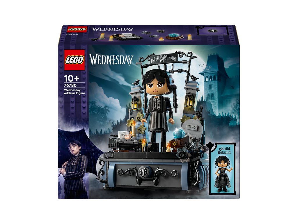 Děti od 10 let se se stavebnicí Figurka: Wednesday Addamsová (76780) mohou těšit na pořádnou dávku záhad a chaosu. Tato dárková stavebnice LEGO® s Wednesday obsahuje sběratelský model s pohyblivou hlavou, rukama a nohama, a navíc 2 obličeje a 2 druhy oblečení, se kterými si malí stavitelé figurku přestaví podle svého gusta. Součástí sady je věrný parťák Věc, stojan s černými jiřinami a 2 skryté prostory, ve kterých uchováte poklady, jako jsou šaty z Havranbálu nebo její uniforma. Nechybí také brána akademie Nevermore a Wednesdayiny doplňky, včetně psacího stroje, Neronova hrobu, křišťálové koule a dalších prvků.